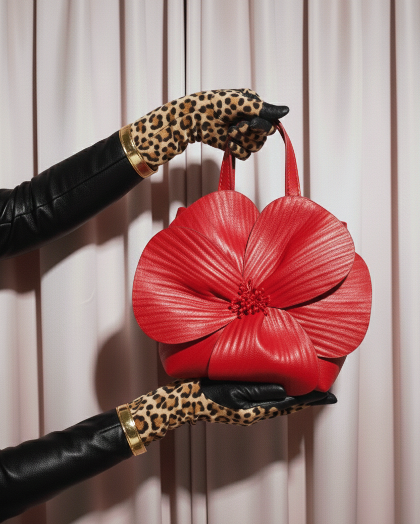 A sculptural mini bag defined by a large, three-dimensional floral appliqué that creates a bold and romantic silhouette. Its vibrant faux leather and textured petals make it a striking statement piece designed to be the focal point of any ensemble.