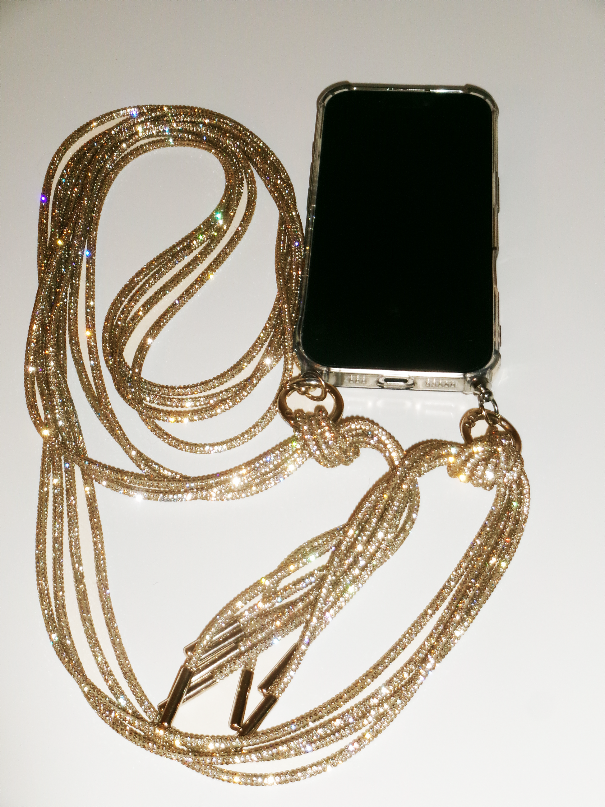 A sleek and functional phone strap made from a luminous thread coated with transparent micro-crystals, finished with polished metal tips.