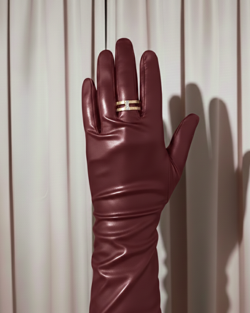 A structured, double-banded ring crafted from polished rose gold-toned metal, featuring a geometric grid-like texture. The two parallel bands are connected by vertical pillars, creating a architectural open-space silhouette. The central pillar is set with four petite, round-cut crystals, adding a refined touch of brilliance to the industrial-inspired design.